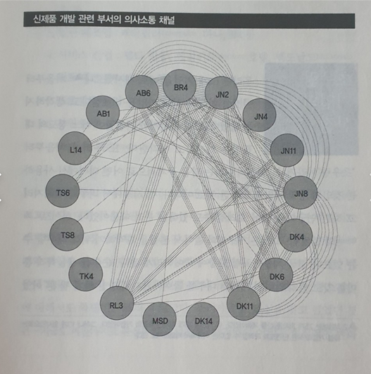 위의 사진은 높은 수준의 기술적 능력을 요구하는 업종에서 모험적이라고 자인하는 사업을 벌인 신제품 개발 담당 매니저가 그린 그림이다. 이 그림을 보면 공식적인 의사소통 채널이 무려 223개나 됨을 알 수 있다. 이 회사가 경쟁 기업에 비해 신제품을 출시하는데 걸리는 시간이 길 것임은 두말할 필요도 없다. 역설적이면서 비극적인 것은 이 223개의 의사소통 채널을 하나하나 살펴보면 더할 나위 없이 잘 짜여 있다는 사실이다.