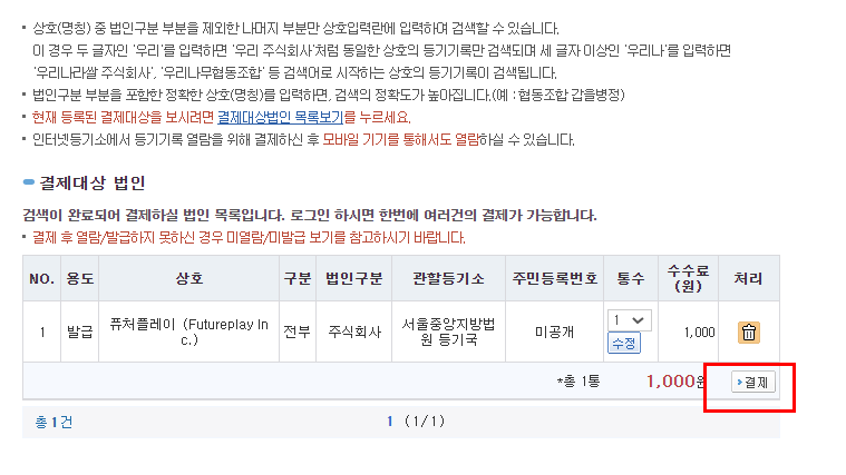 페이지 하단을 보면 이렇게 등기부등본 조회를 원하는 회사의  정보가 보일것입니다.