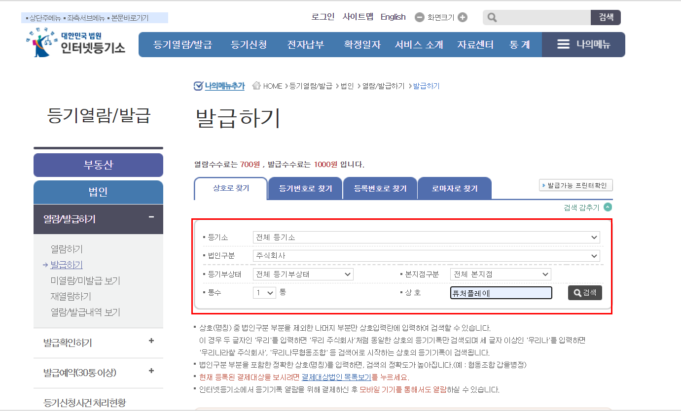 상호-> 등기부등본 조회 를 원하시는 회사 상호를 작성하시면 됩니다.