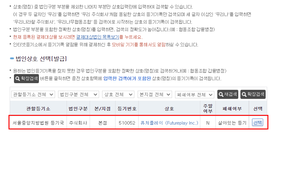 페이지 하단을 보면 이렇게 등기부등본 조회를 원하는 회사의 정보가 보일것입니다.
