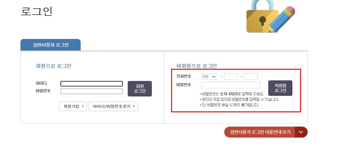 비밀번호 -> 핸드폰 마지막 4자리 를 입력해주시면 됩니다.