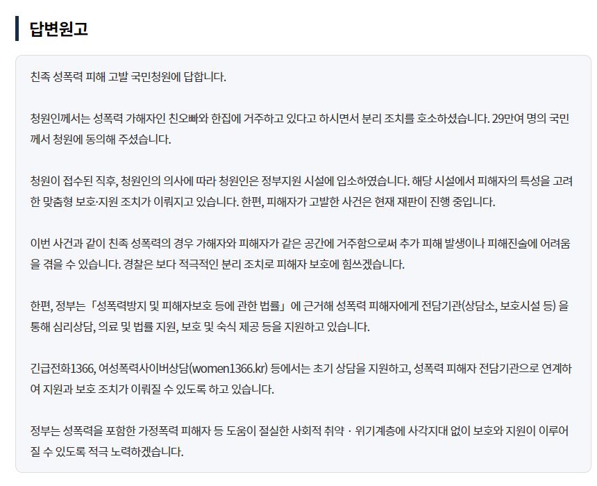 이사건은 무려 약 30만명이 동의를 한 청원이고 이에 관한 청와대의 답변은