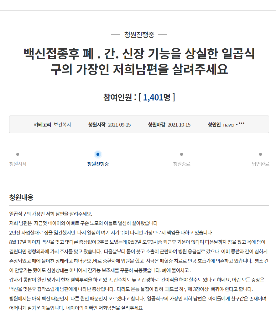 "일곱 식구 먹여 살리는 남편, 백신 맞고 폐·간·신장 기능 잃었다" 청원
