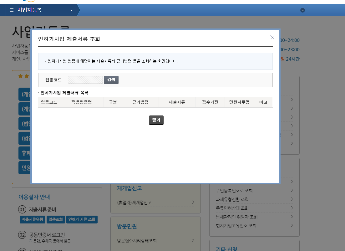 5. 업종코드 "검색" 을 합니다.