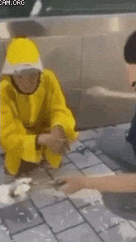 할머니가 거부하자 주변 위안부 소녀상 앞의 국화꽃으로 할머리를 때리며